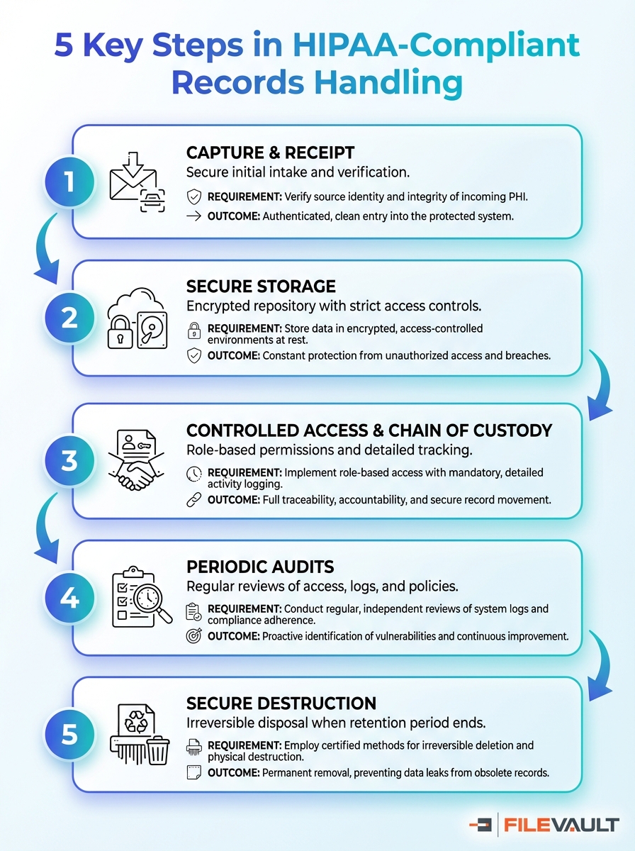 Infographic showing 5 key steps in HIPAA-compliant records handling.