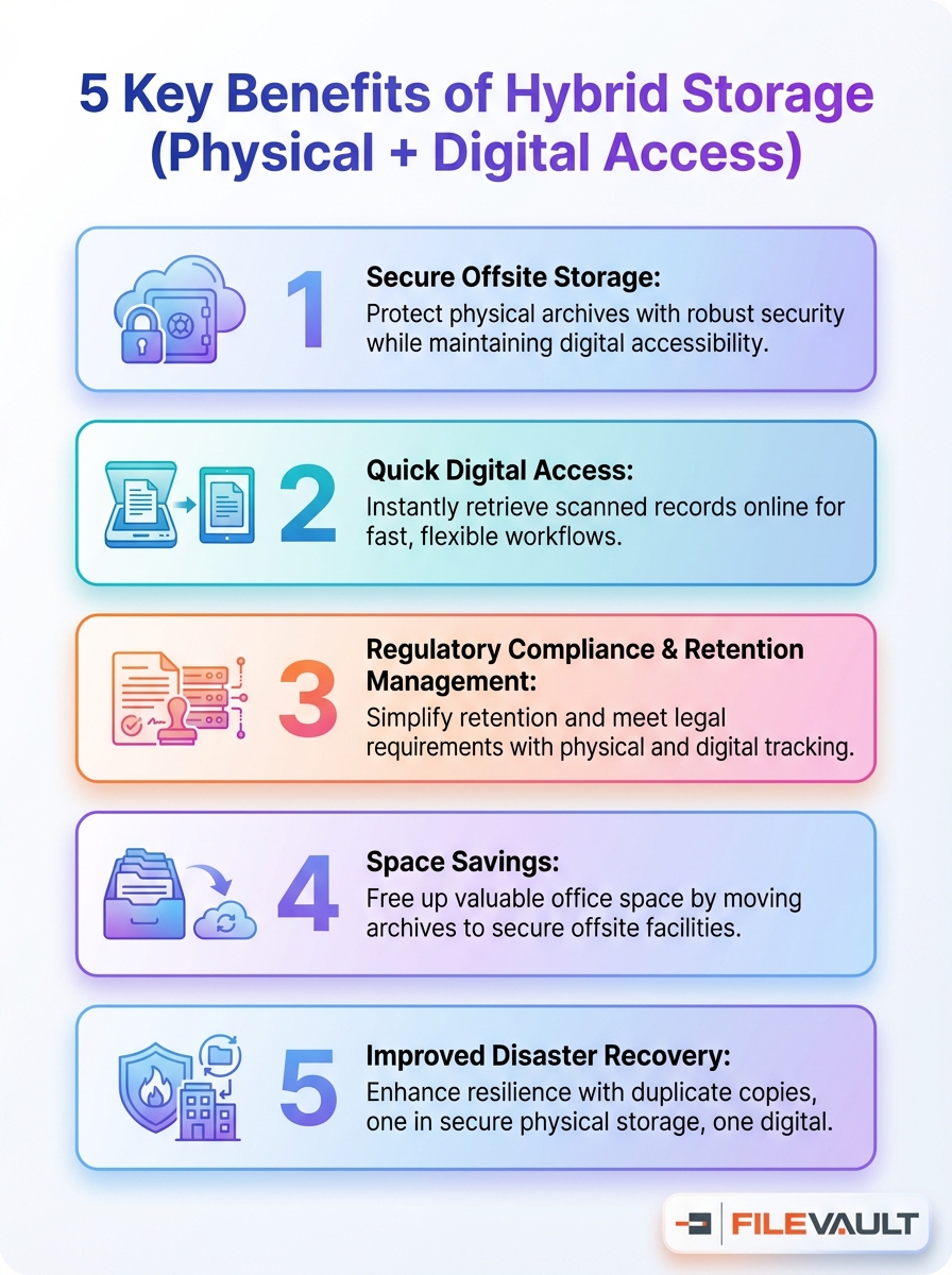 Hybrid storage: balancing physical archives with flexible digital access - infographic of 5 key benefits.