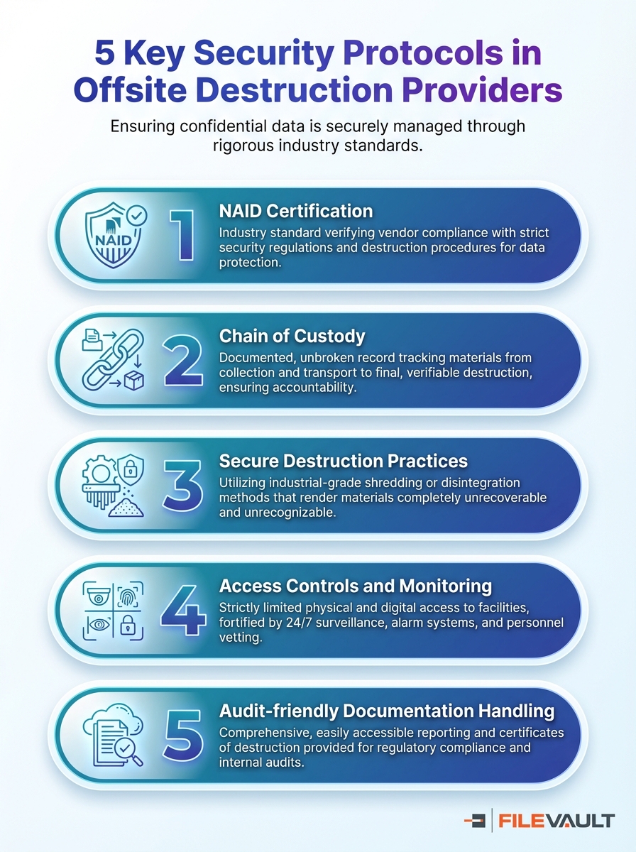 This infographic highlights the five key security protocols used by offsite destruction providers. It explains how these practices safeguard sensitive data during destruction.